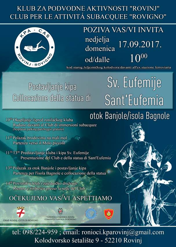 U nedjelju 17.09.2017. godine u organizaciji KPA ROVINJ odvija se akcija polaganja replike kipa sv. Eufemije, zaštitnice grada Rovinja (podmorje kod otoka Banjole).